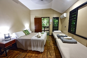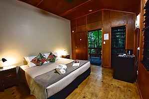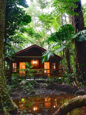 All cabins are crafted from natural materials that are designed to blend into the rainforest surrounding and feature air-conditioning and private ensuite bathrooms, excepting the five-bed Pixie Dorm rooms that have a shared bathroom.