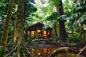 Located on seven acres of pristine rainforest, the property also features a saltwater swimming pool and wooden deck, a fully equipped guest kitchen and private access to Cape Tribulation Beach (voted by Lonely Planet as one of the top 100 beaches in the world).