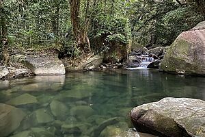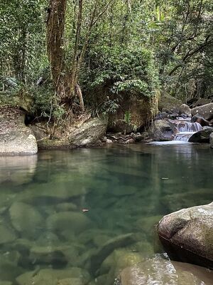 Daintree Secrets is situated too high (about 150 metres above sea level), and the water is too cold, for crocodiles.